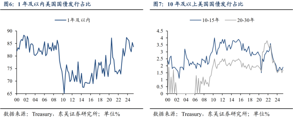 如果我们将上述数据频次的颗粒度从年度细化到季度、并加入到期国债的发行期限后可发现(图4-5),2000年以来,1年期美国国债到期占比稳定在25-40%,1年与1-5年期美国国债合计到期占比稳定在70%附近。这也交叉论证了前述美国国债的到期高峰一直是集中在近端而非远端的观点。